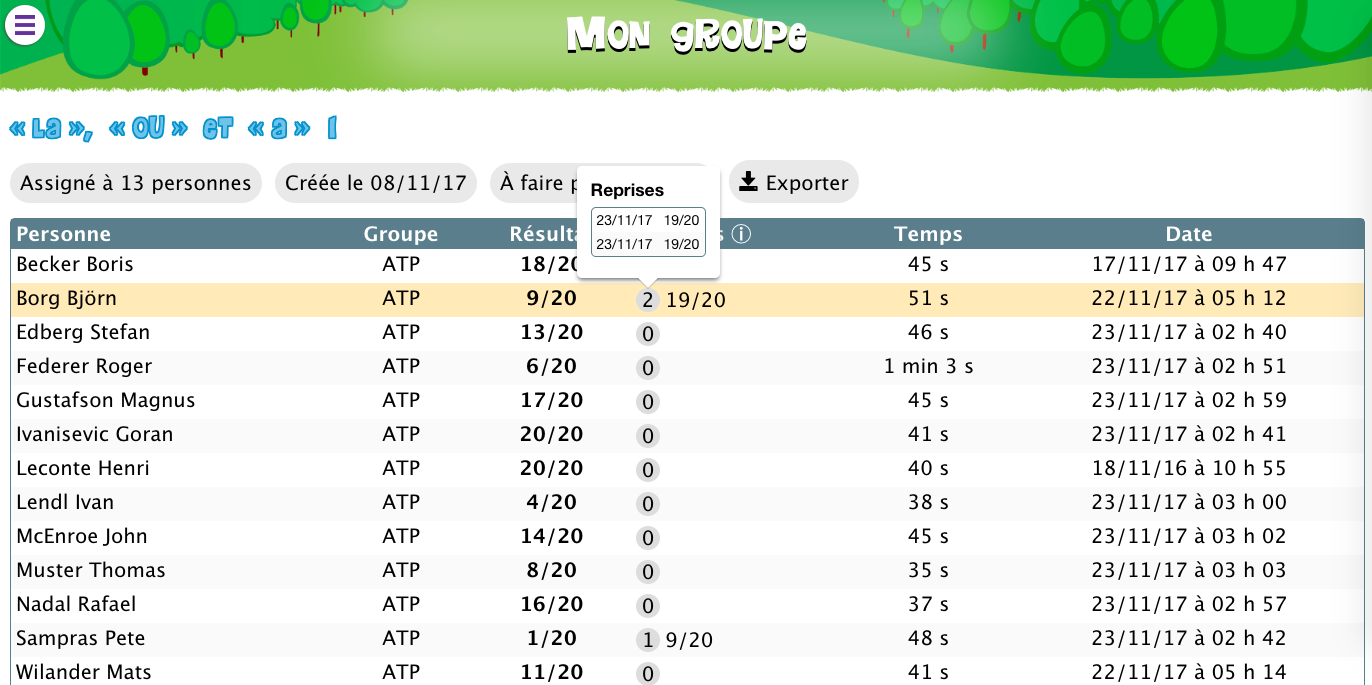 Si vous souhaitez qu’un élève refasse le même exercice, vous pouvez néanmoins suivre ses essais subséquents en vous référant à la colonne « Reprises » du tableau de suivi. Le nombre d’essais après le premier y est noté et, en cliquant sur le nombre, vous afficherez le détail des résultats obtenus. En cliquant sur un résultat, vous afficherez l’exercice en question.