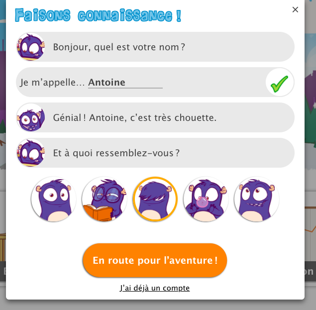 3) Choisissez votre nom de profil et votre avatar puis valider votre choix en cliquant sur le bouton « En route pour l’aventure ».
