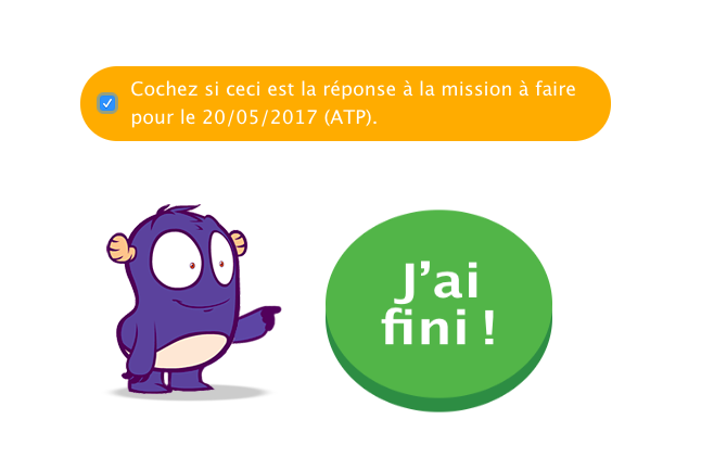 Une fois son exercice terminé, l’élève coche la case validant qu’il s’agit bien de la réponse à la mission. Attention de ne pas oublier, sans ça l’exercice ne s’affichera pas dans votre tableau de suivi (et il n’est pas possible de revenir en arrière). Puis, il clique sur le bouton « J’ai fini », validant ainsi l’exercice. Son travail est terminé !