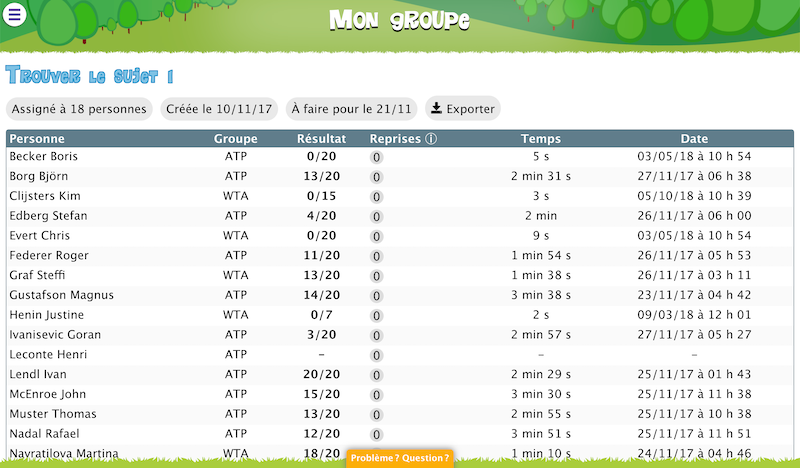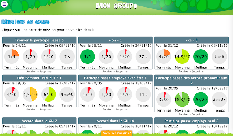 Dans la section « Mon groupe » de votre compte enseignant, vous trouvez un récapitulatif de l’ensemble des missions ainsi que le détail des résultats pour chacune d’entre elles.